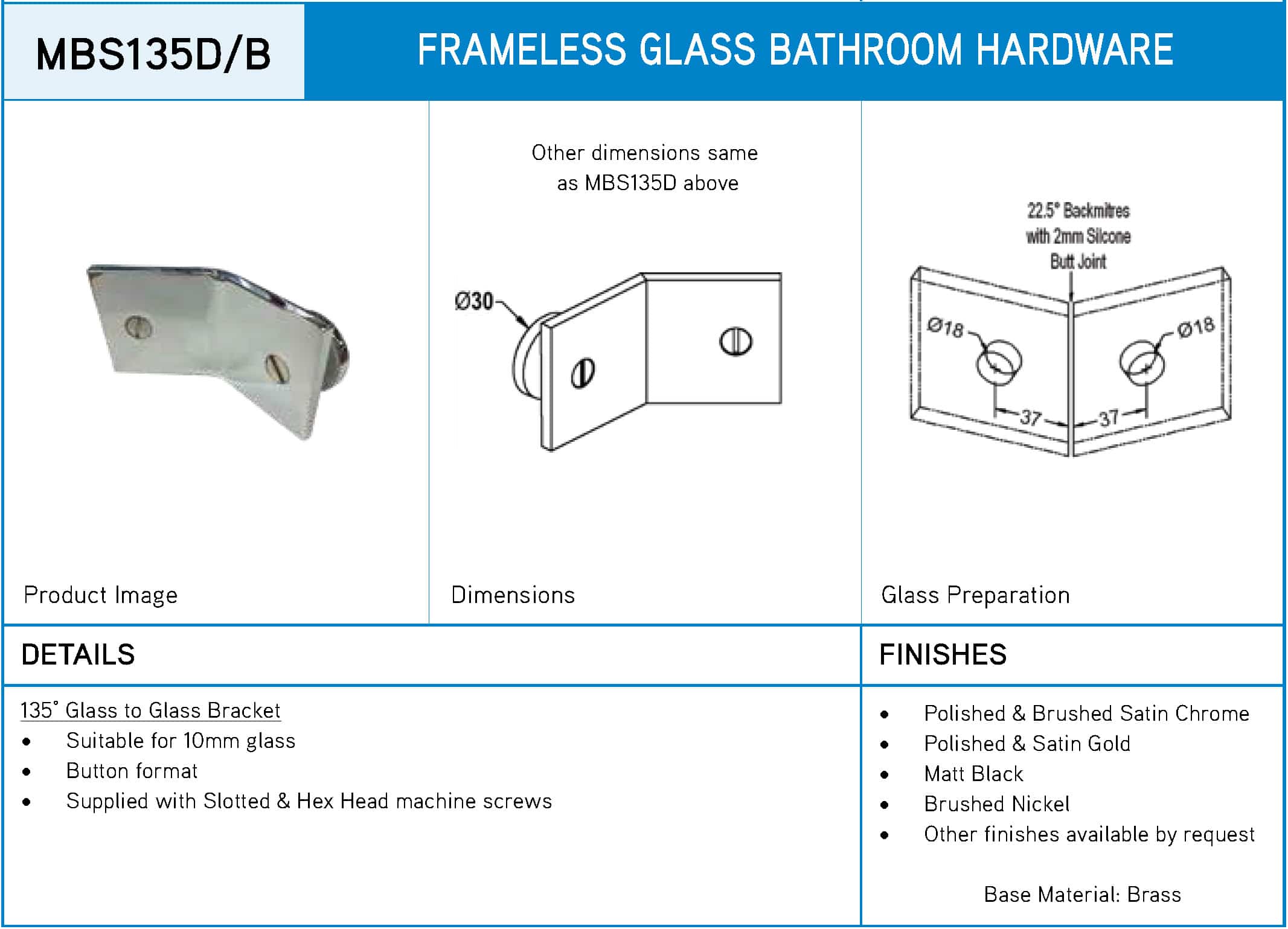 Modern 135° Square Glass to Glass Shower Bracket (MBS135D/B)