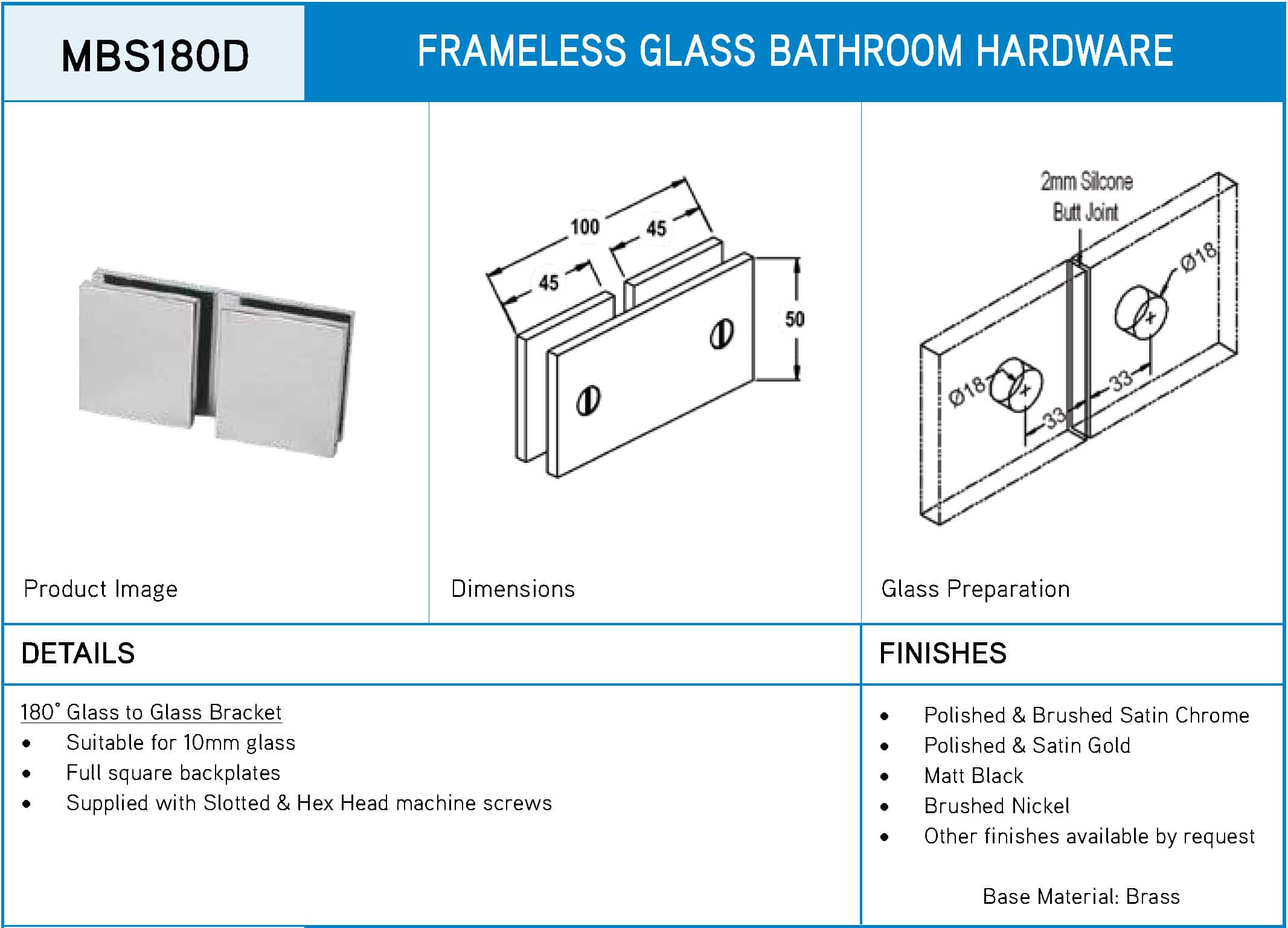 Modern 180° Square Glass to Glass Shower Bracket (MBS180D)