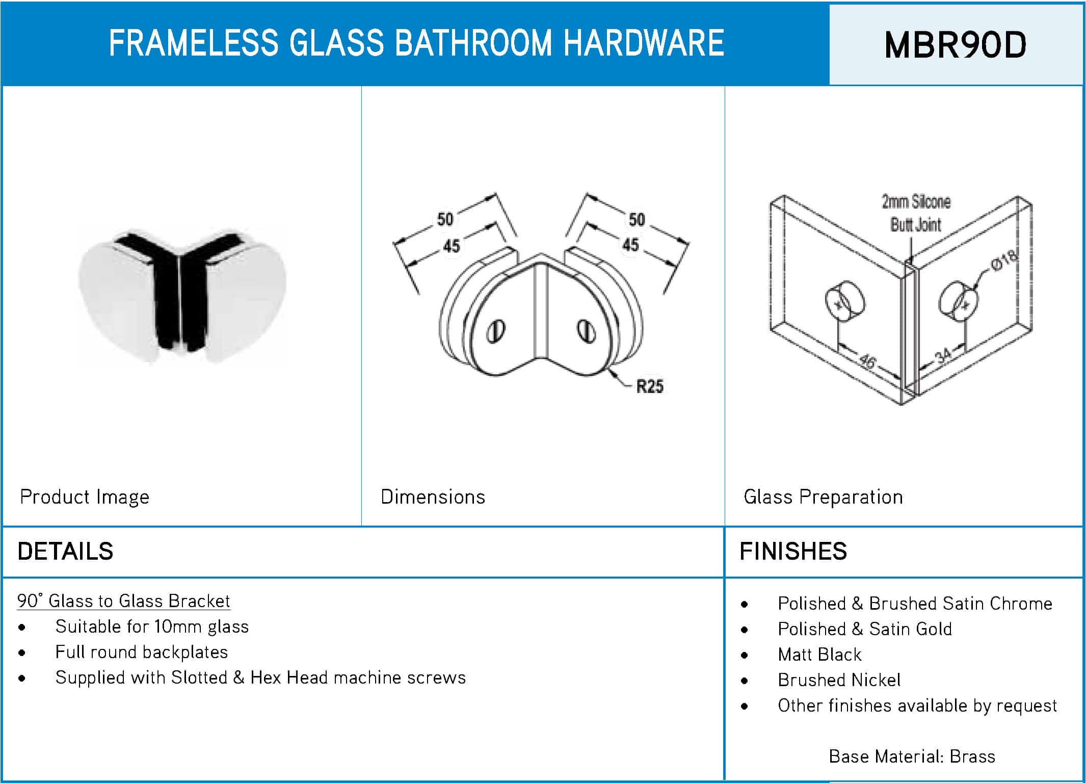 Modern 90° Round Glass to Glass Shower Bracket (MBR90D)